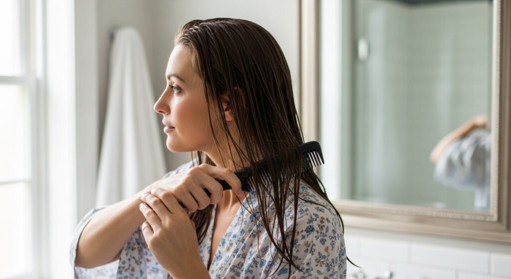 Wet hair is fragile and stretches easily. Pulling a brush through tangled strands may cause breakage. Using a wide-tooth comb and working slowly from the ends protects hair from unnecessary damage.