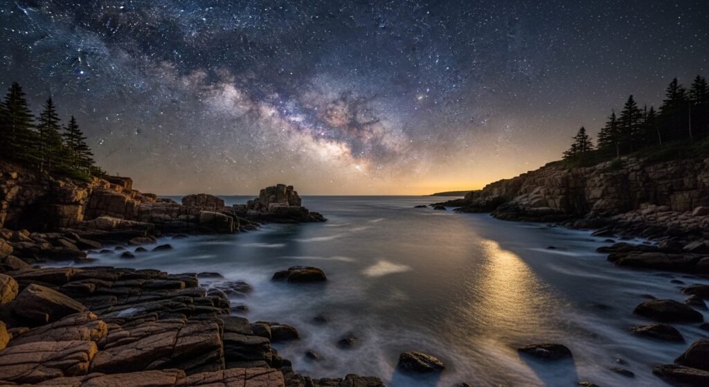 The Acadia National Park resorts to stargazing along rocky beaches. Despite its proximity to population centres compared to western parks, there are some areas which are remarkably dark and offer some serene oceanfront sites.
