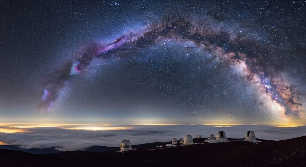 The Mauna Kea mountain is approximately 14000 feet above sea level. It is raised so high and creates great clarity, as it is not near the lights of the city. When the sky is clear, the Milky Way is very bright, and the horizon is infinite.