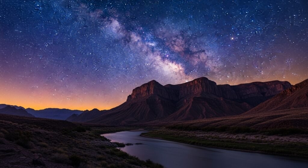Big Bend National Park has extensive desert views and low levels of light pollution. The Rio Grande is surrounded by the silence of the park, and the stars above the Grand Ranch provide the dramatic canopy of the distant West Texas sky.