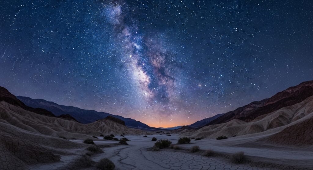 The Death Valley National Park is a combination of dry air and huge valleys. The dry air contributes to greater visibility and silhouettes on mountains with a sky that is brilliant and full of stars, planets and on rare occasions, meteor showers.