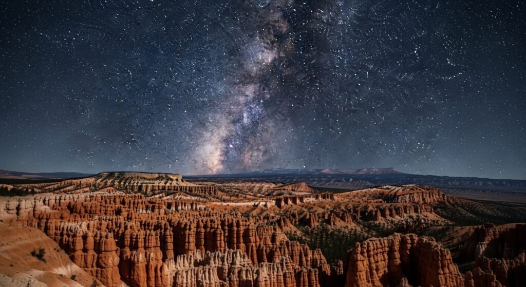 The location of Bryce Canyon National Park is at a high elevation, which makes the reduction of atmospheric distortion possible. The red rock hoodoos of the park contrast with the bright constellations, creating a dramatic and, at the same time relaxing setting.