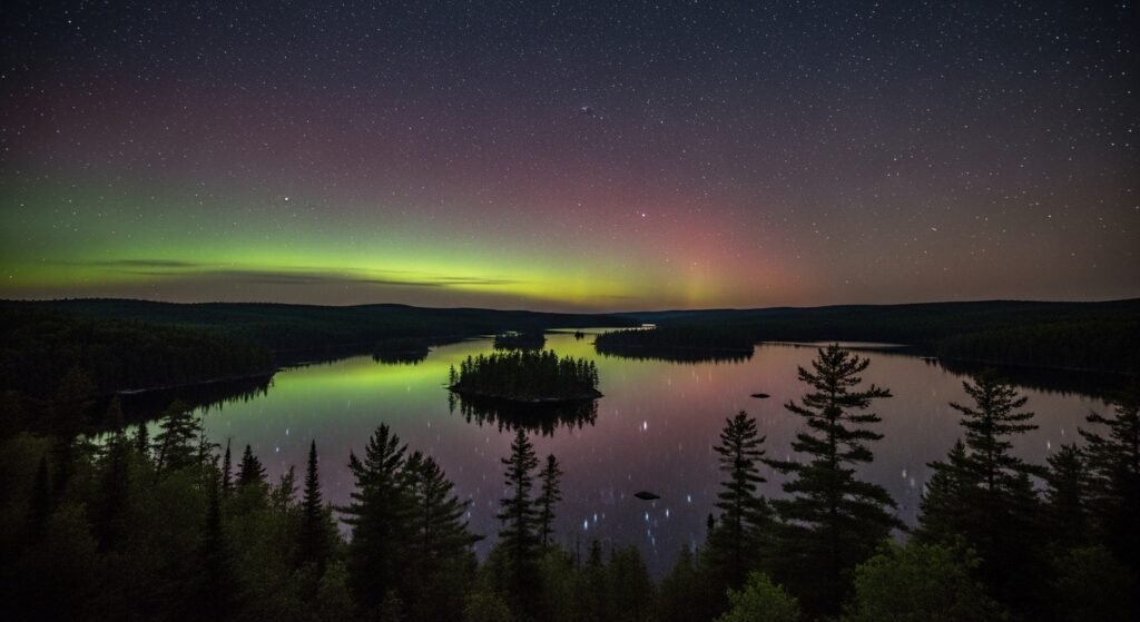 Voyageurs National Park is characterised as having interlocked waterways and secluded campsites on the shoreline. There is little artificial lighting, and so the visitor can see a sky full of stars and in some seasons the aurora borealis.