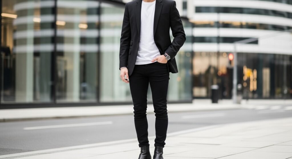 Black, fitted jeans bring about harmony. No distress fades or heavy fades. Clean lines matter. Structured denim is meant to be purposeful when worn with a blazer. It is a balance between professional polish and evening casualness and does not seem overdressed.