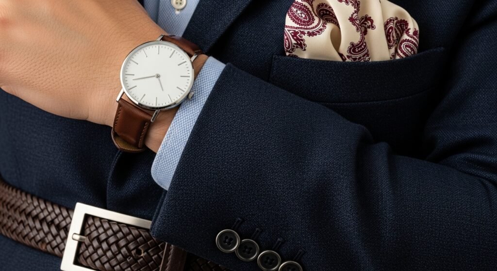 A square pocket, a skinny watch or a belt with some texture gives it character. Keep details subtle. Do not overload the elements. The main item is the blazer, and accessories do not make noise but intensify the overall effect.