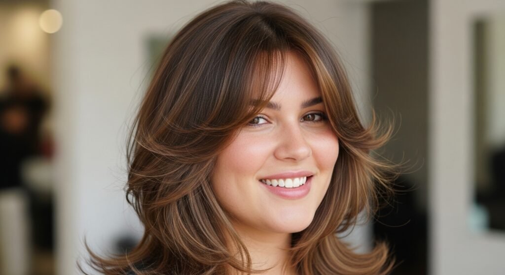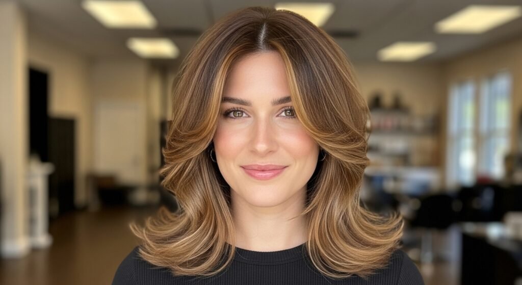 Madhuri Dixit is the one who is adorned with feathered layers encircling the face. This is a lift-giving technique without bulk. The layers begin underneath the cheekbones. The impact is light-handed and balanced.
