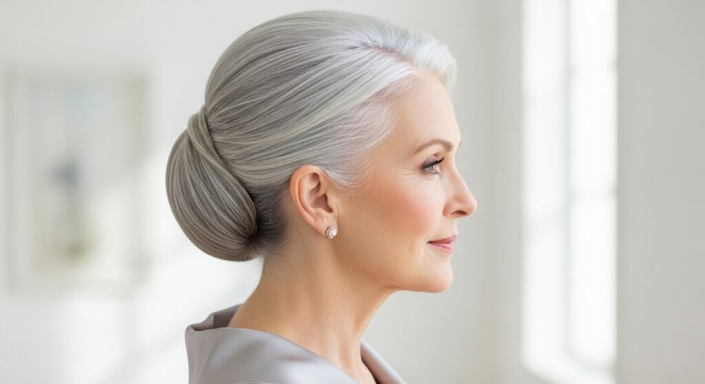 A low nape bun is subtle oozing luxury. It collects gray hair in a very stylish manner besides presenting its natural dimension. This hairstyle not only fits in formal and day to day style but it is also versatile and elegant.