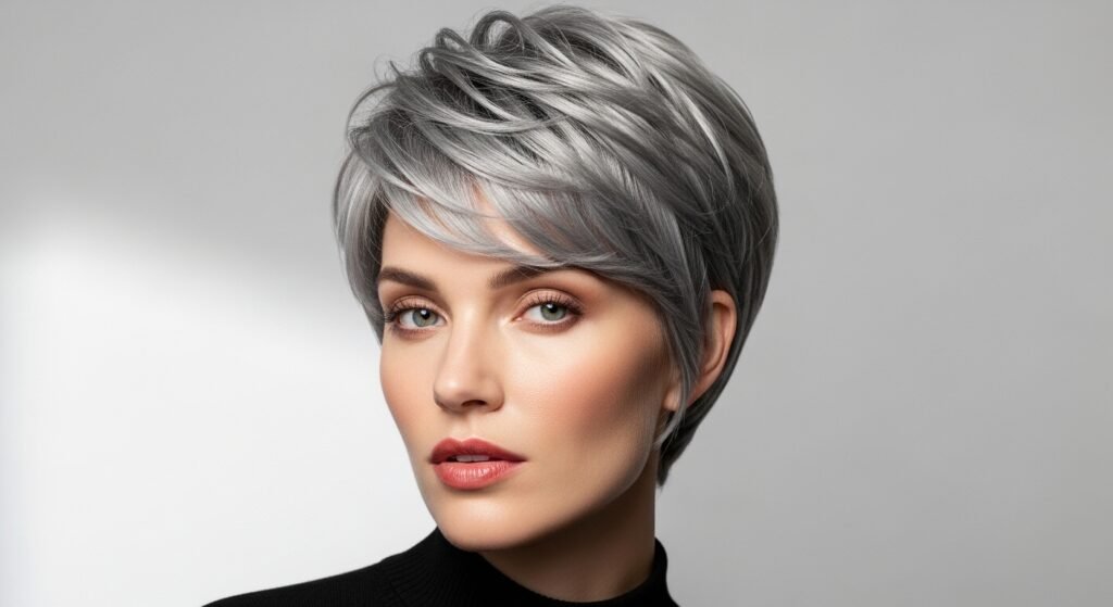 A pixy shade with a texture provides striking sophistication without focusing on heavy make-up. Dimension is created with short layers to make the silver strands look vibrant and lively. This slice accentuates the facts of the face and provides a fresh touch of gray that is natural.