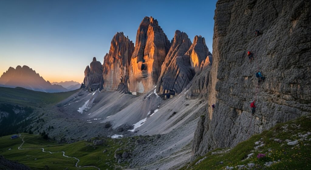 These limestone hills are pale and provide lengthy and historic paths, which require endurance and calmness. The dramatic verticality is opposed to soft alpine fields below. The climbers come back to go through the challenge and experience the culture.