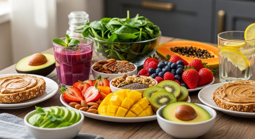 High antioxidant diet helps in the general health of the skin. Give fruits and leafy vegetables, nuts, and seeds. Good food also assists in repairing skin and keeping a unblemished and clean surface.