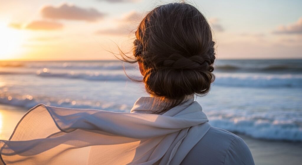 Hair can be tangled within a short time by the wind. We wear loose buns, or put our hair low and slightly braided to reduce friction as we go out. It causes the hair shafts to lie flat and helps prevent them from breaking when moved too much.