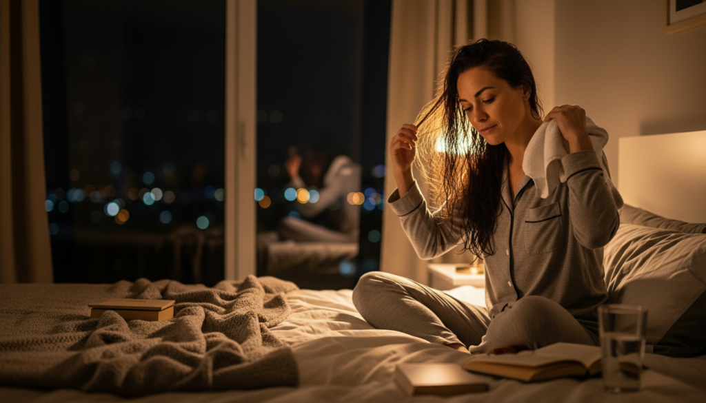 At night, it is recommended to wash hair as it would naturally dry at night and be styled in the morning. This reduces heat exposure. It is advisable to make sure that most of the strands are dry before going to sleep, otherwise they might flatten and/or cause inconvenience on the scalp.
