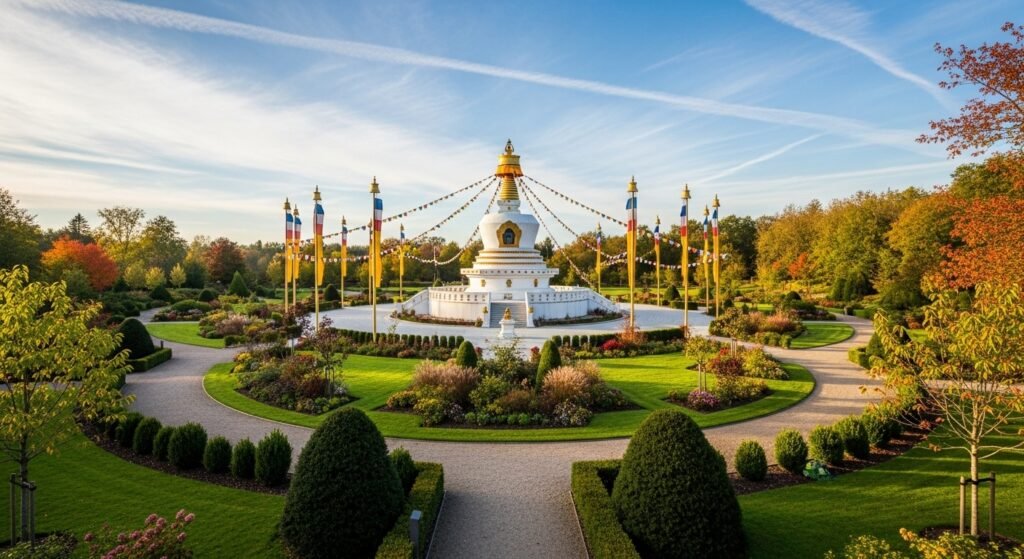 The tranquil Peace Park and Amitabha Stupa are available to the visitor who wants to have some quiet moments. Prayer flags are swinging in the wind. Walking mindfully is in the spirit of the open landscape, which is a tranquil experience influenced by spiritual tradition and natural beauty.