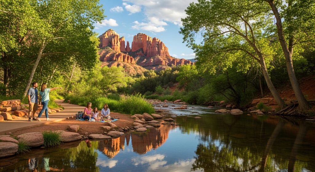 Near Red Rock Crossing, lawn paths access circum the creek on open terrains. The space is easy and spacious. Tourists have an opportunity to just take a break by the water, view the surrounding formations and learn to slow down in their pace and see Sedona.