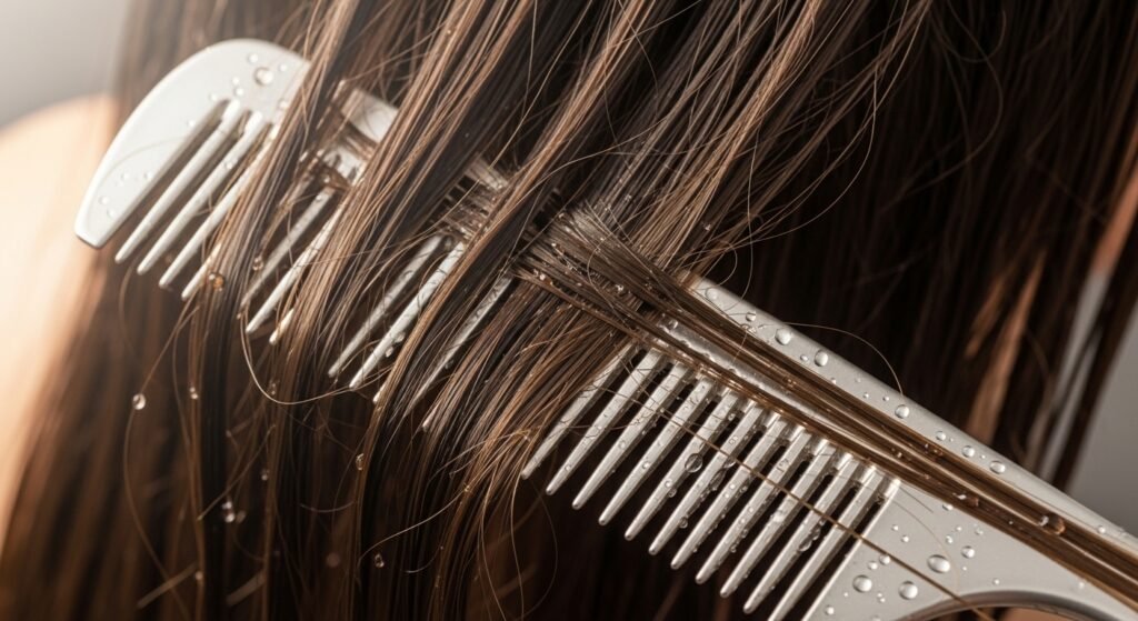 Detangle damp hair with the help of a wide-tooth comb. Beginning at the ends, and proceed gradually upwards. Straining hair enhances hair loss. In this step, being patient avoids unwarranted harm and split ends.