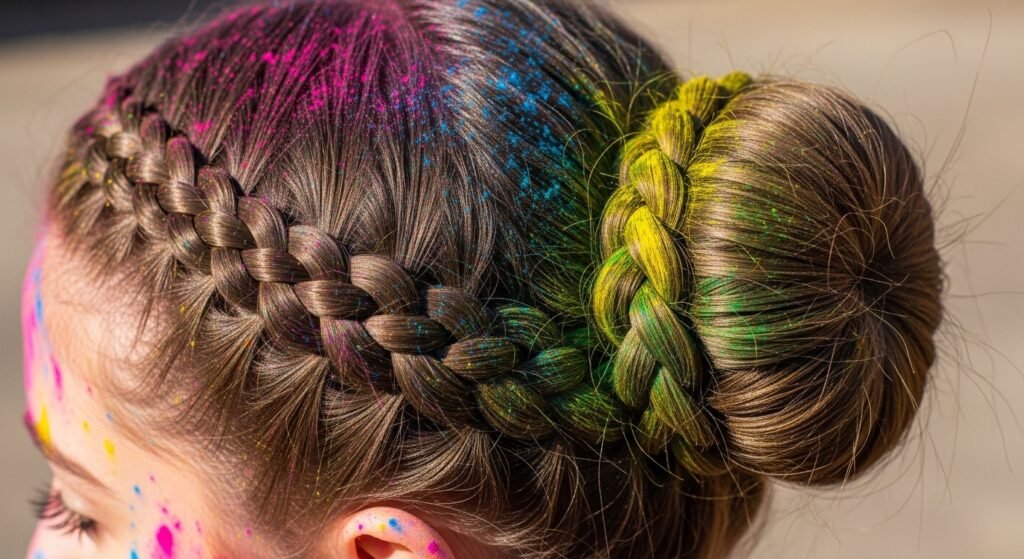 Have hair in a braid or a bun. Careless hair is so much used on throwing wet colors. A tight hairstyle helps to eliminate knots and friction which makes washing and de-tangling hair in the post celebration times much simpler.