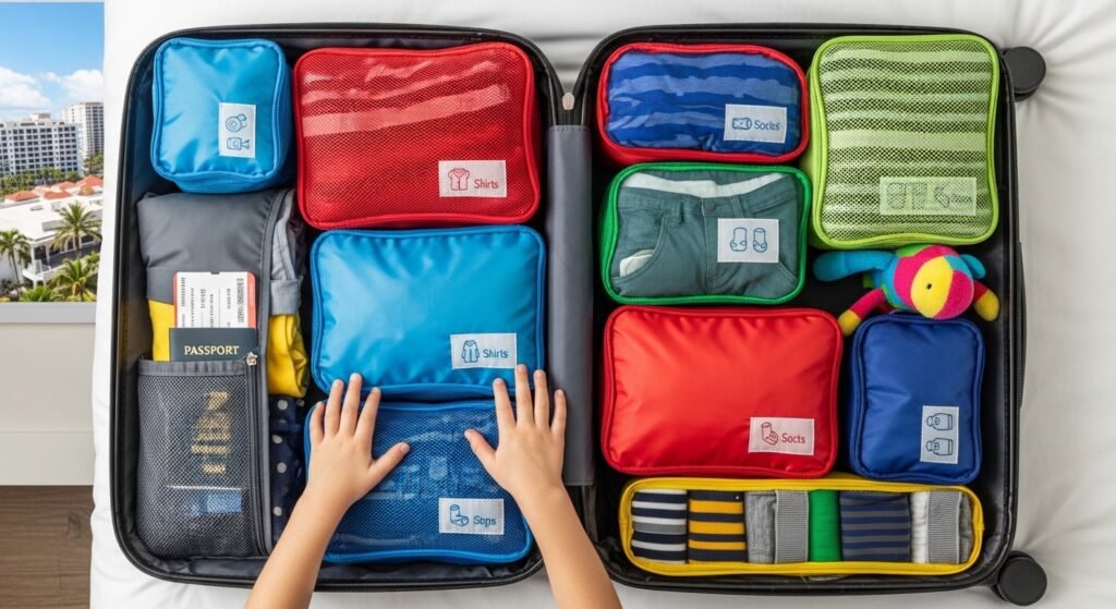 Strategic unpacking on arrival. Give each child a special shelf or a drawer. Determine shoes and bag destinations. A fast setup brings about order and eliminates frequent searching during the stay.