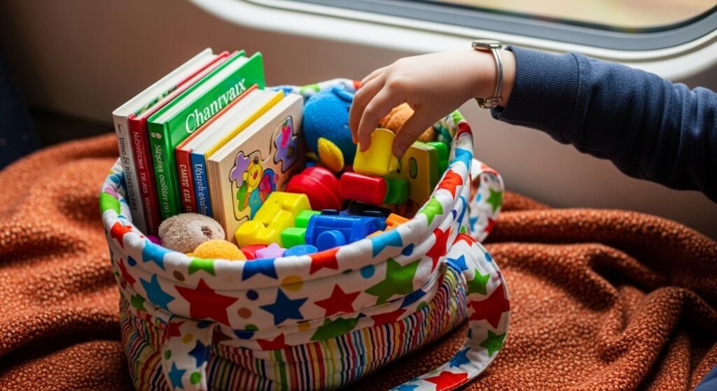 Make a small bag with new books, puzzles or quiet activities. distribute them slowly in the course of long journeys. Diluted surprises ensure one becomes interested and not bored without necessarily relying on screens fully.