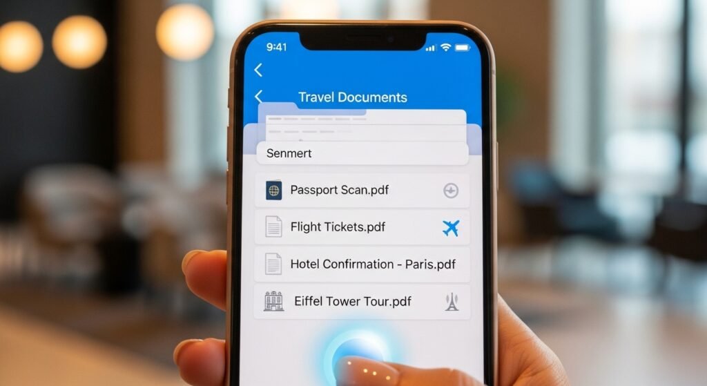 Keep electronics such as passports, tickets, hotel reservations and emergency contacts in your cell phone. Back up by emailing yourself. Having access to these documents very fast, it saves time and avoids panic in case of missing printed documents.