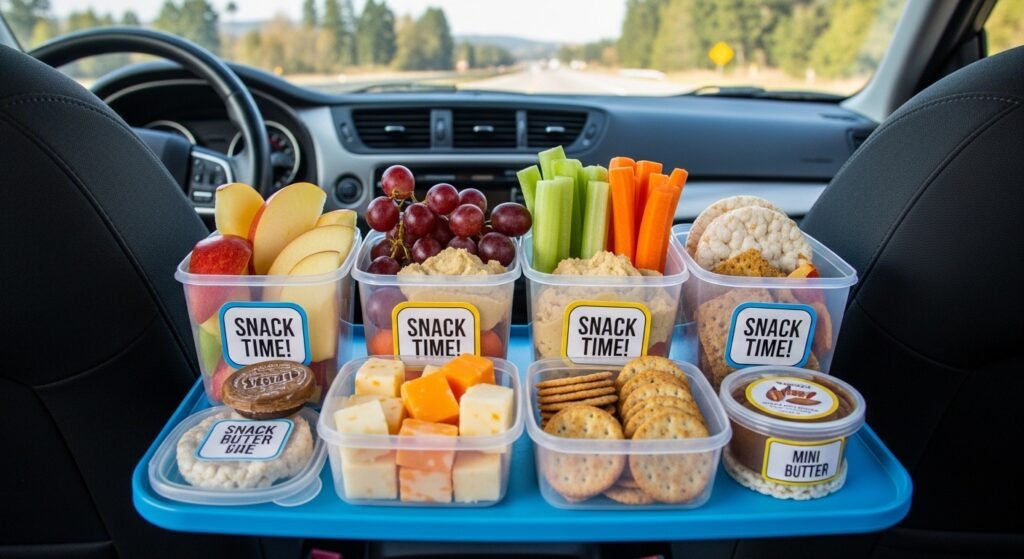 Prepare small portions of snacks that do not require mess, pack them. Hungry children get irritable fast. Provider of healthy snacks at the appropriate time maintains energy level and mood balance even on road trips or flights.