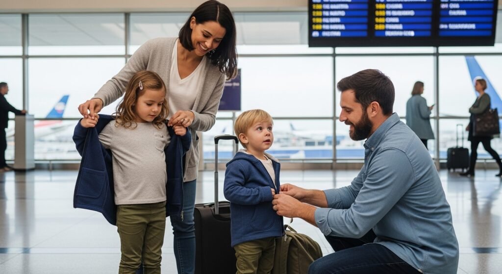Wear children in easy clothes and easy-to-put-on shoes. There is a difference in temperature between airports, cars and hotels. Layering also makes everybody comfortable without the frequent changes in wardrobes.