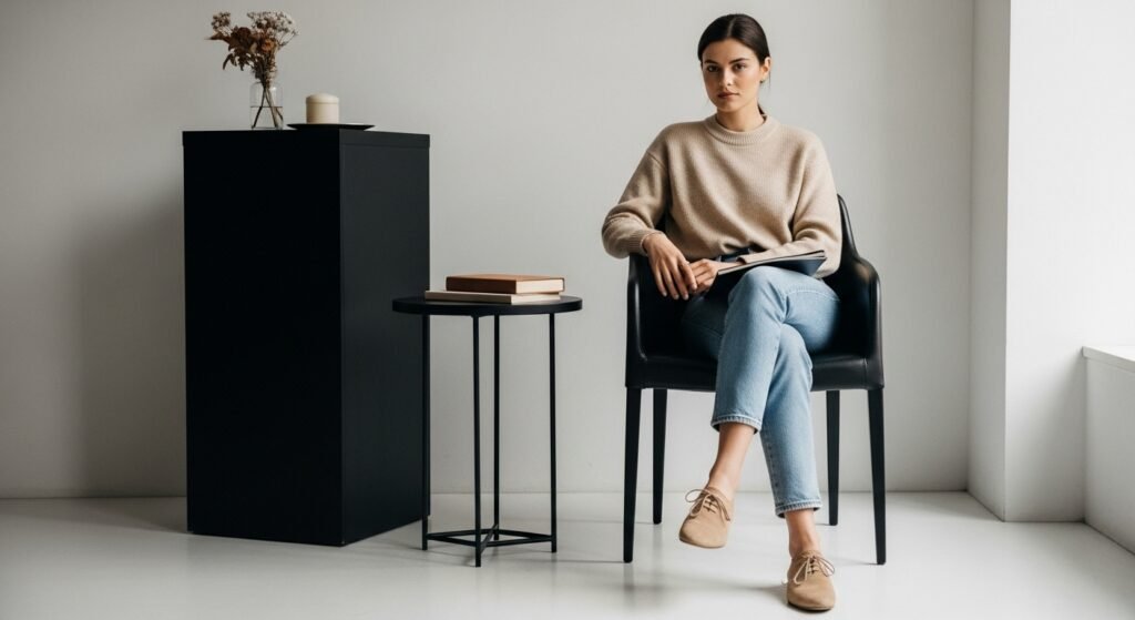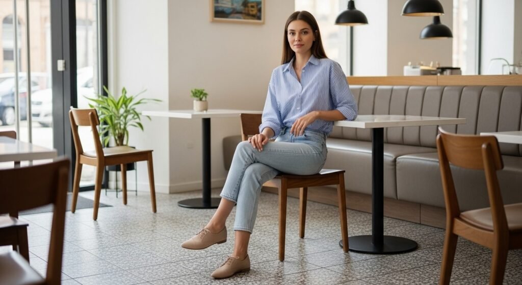 Beige shoes add freshness to light jeans. They keep the outfit airy and minimal while still looking stylish. This combination works especially well for dynamic looks, casual outings, and relaxed brunch and shopping.