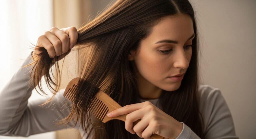 Gently detangle dry hair before stepping into the shower. This reduces knots and breakage during washing. Start from the ends and move upward slowly. A few careful strokes can prevent unnecessary stress on strands.