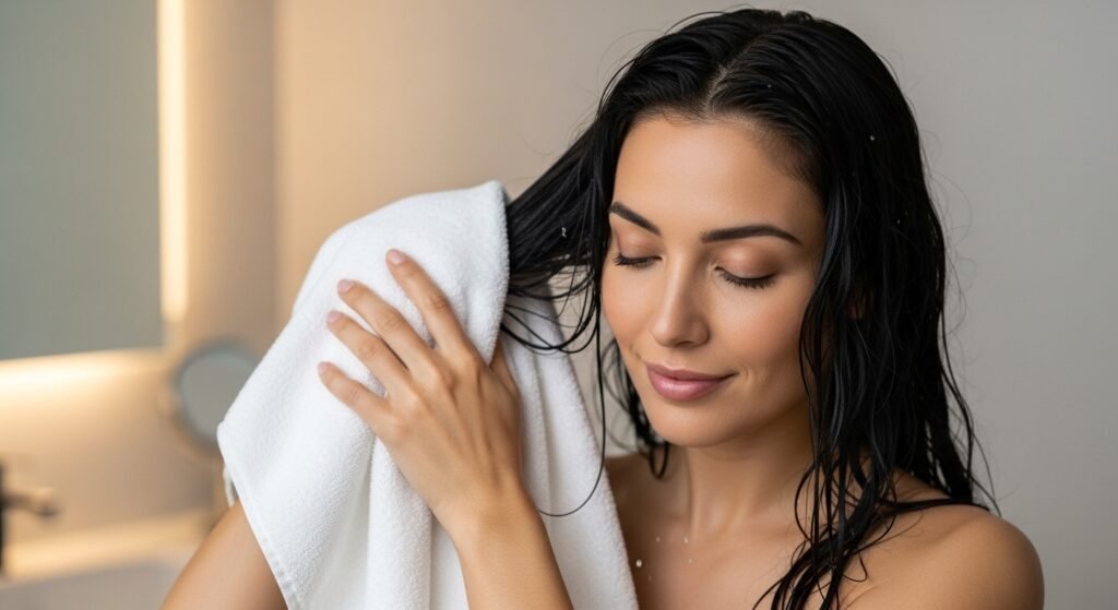 After washing, gently squeeze out excess water. Use a soft towel to pat hair dry instead of rubbing it vigorously. Rough drying weakens the outer layer and causes unnecessary frizz.