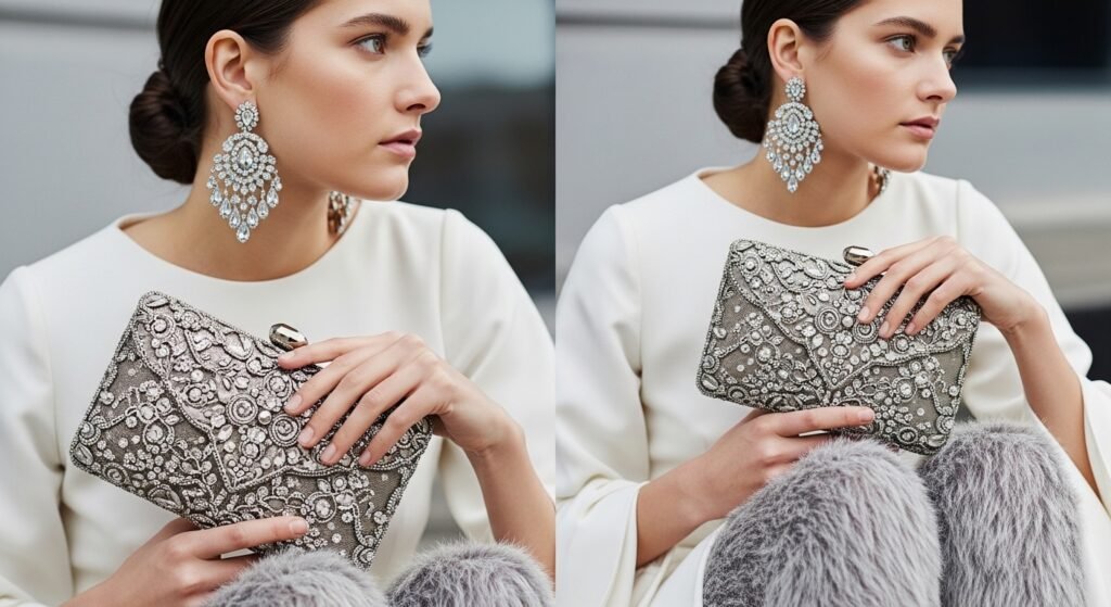 Winter clothes glorify bright earrings, jeweled purses, or furred tights. Accessories may be used to provide glitz and flair. Seasonal fabrics are enhanced by metallics, crystals and rich finishes.